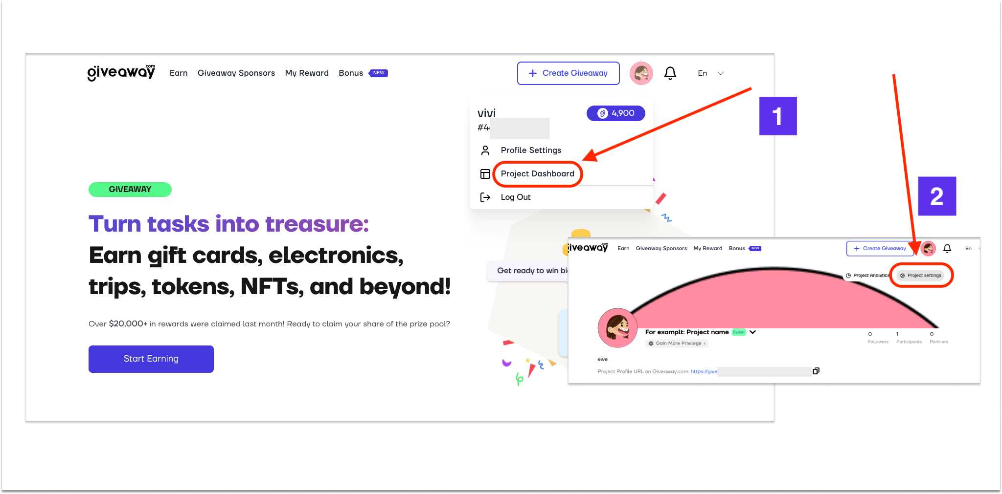 **Step 1:** Log in to [giveaway.com](https://giveawy.com). On the website, locate the avatar in the upper right corner and locate **Project Dashboard > Project Setting.**&#x20;