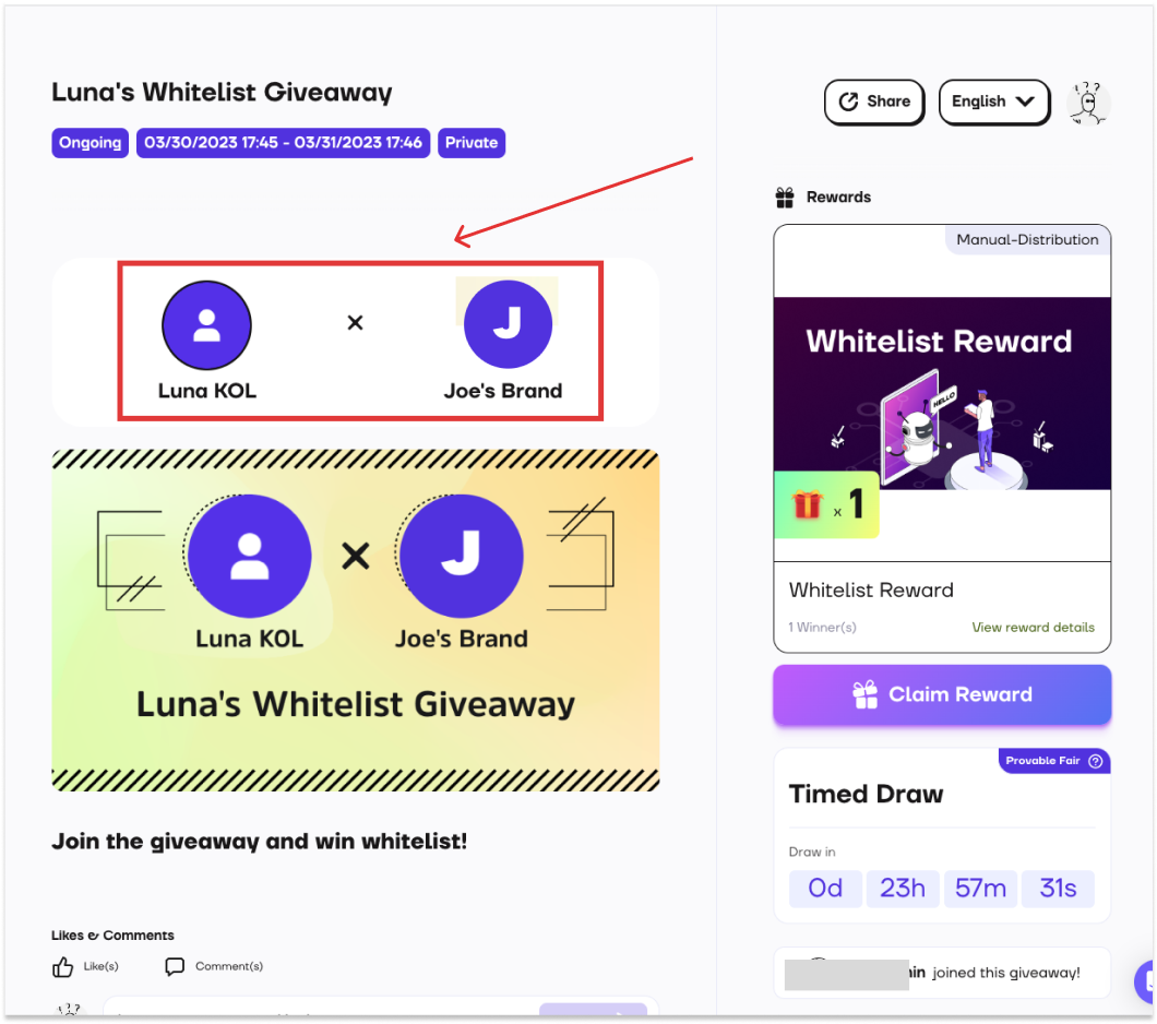 In giveaways, you can do a co-host with another project, brand, or influencer joining forces with the primary host to reach a larger audience and increase engagement.