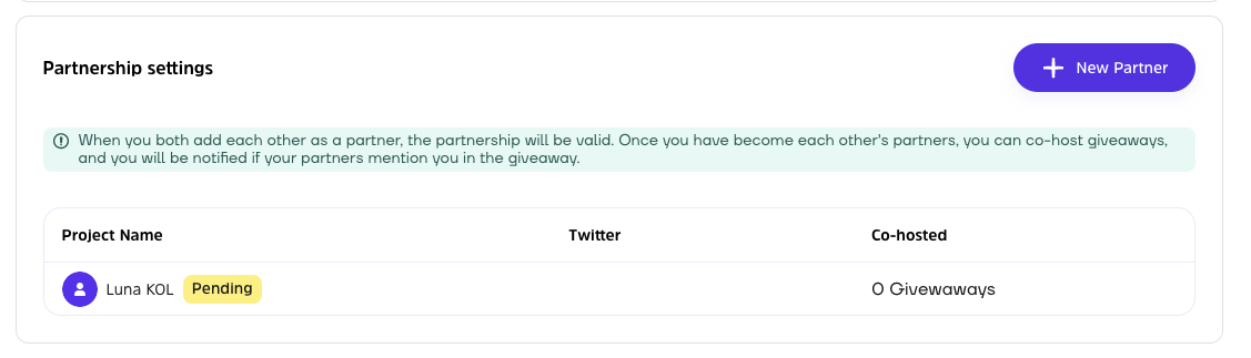 **Step 3:** At this time, you will see that the partnership is **Pending**. This is because the other project must also add your project as a partner (repeat the above steps). Once both parties have done this, the partnership can be established.
