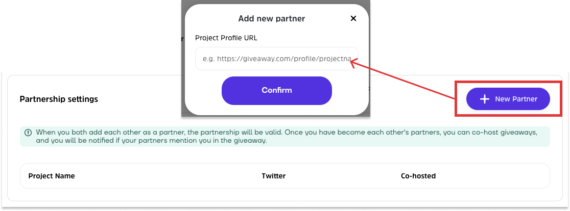 **Step 2:** Scroll down to the bottom of the settings page. Under the Partnership settings, click **+New Partner**. Then enter the **project profile link** of the project you would like to add as partner.